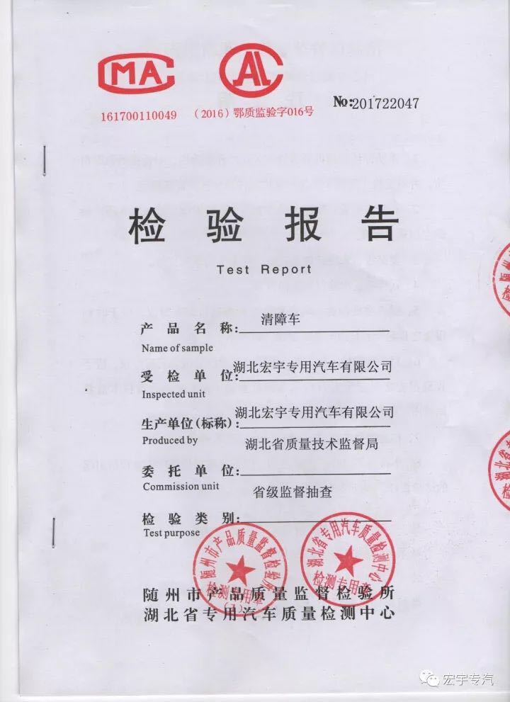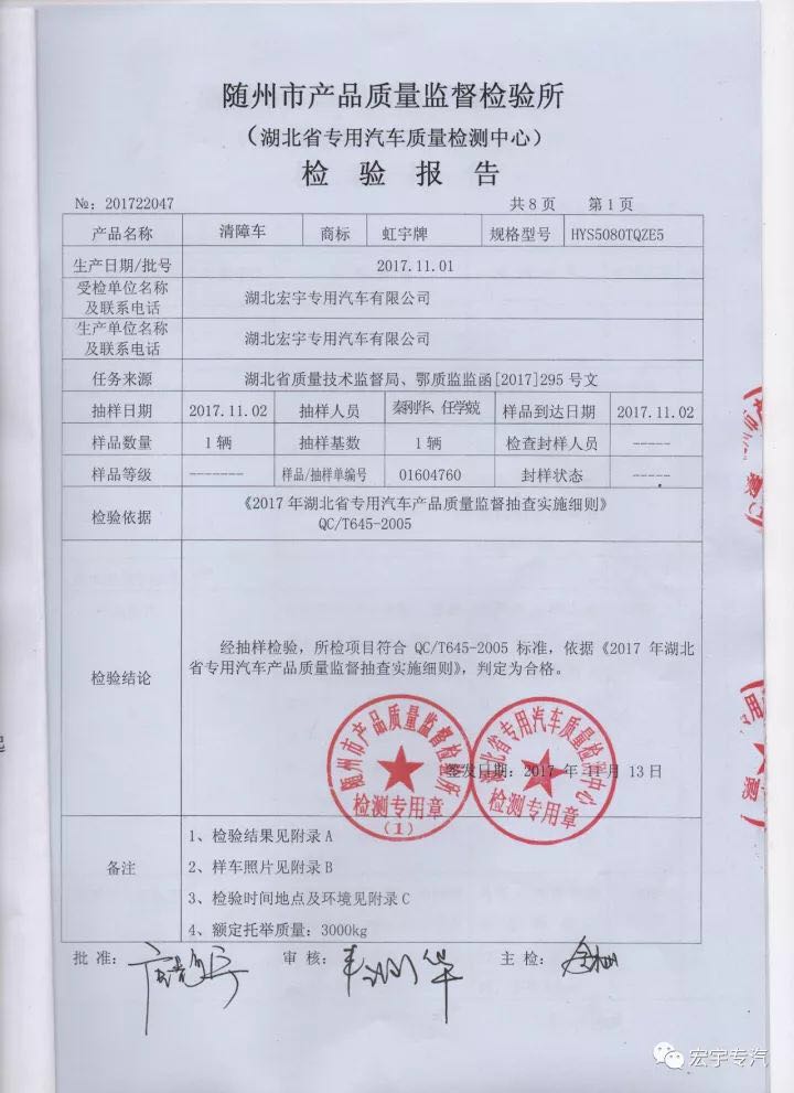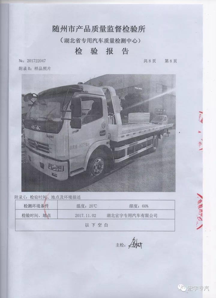 虹宇牌清障车通过湖北省质量技术监督局质量监督抽查